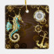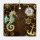 Brauner Holzboden mit Meer, mechanischer Rücken, antikes Lenkrad, goldener Anker und verschiedene Gold- und Messinggetrieben. Steampunkstil.