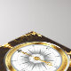 Brauner Holzboden mit Meer, mechanischer Rücken, antikes Lenkrad, goldener Anker und verschiedene Gold- und Messinggetrieben. Steampunkstil.
