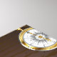 Brauner Holzboden mit Meer, mechanischer Rücken, antikes Lenkrad, goldener Anker und verschiedene Gold- und Messinggetrieben. Steampunkstil.