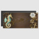 Brauner Holzboden mit Meer, mechanischer Rücken, antikes Lenkrad, goldener Anker und verschiedene Gold- und Messinggetrieben. Steampunkstil.
