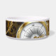 Brauner Holzboden mit Meer, mechanischer Rücken, antikes Lenkrad, goldener Anker und verschiedene Gold- und Messinggetrieben. Steampunkstil.