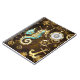 Brauner Holzboden mit Meer, mechanischer Rücken, antikes Lenkrad, goldener Anker und verschiedene Gold- und Messinggetrieben. Steampunkstil.