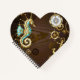 Brauner Holzboden mit Meer, mechanischer Rücken, antikes Lenkrad, goldener Anker und verschiedene Gold- und Messinggetrieben. Steampunkstil.