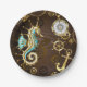 Brauner Holzboden mit Meer, mechanischer Rücken, antikes Lenkrad, goldener Anker und verschiedene Gold- und Messinggetrieben. Steampunkstil.