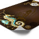Brauner Holzboden mit Meer, mechanischer Rücken, antikes Lenkrad, goldener Anker und verschiedene Gold- und Messinggetrieben. Steampunkstil.