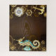Brauner Holzboden mit Meer, mechanischer Rücken, antikes Lenkrad, goldener Anker und verschiedene Gold- und Messinggetrieben. Steampunkstil.