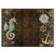 Brauner Holzboden mit Meer, mechanischer Rücken, antikes Lenkrad, goldener Anker und verschiedene Gold- und Messinggetrieben. Steampunkstil.