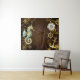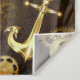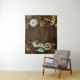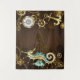 Brauner Holzboden mit Meer, mechanischer Rücken, antikes Lenkrad, goldener Anker und verschiedene Gold- und Messinggetrieben. Steampunkstil.