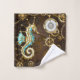 Brauner Holzboden mit Meer, mechanischer Rücken, antikes Lenkrad, goldener Anker und verschiedene Gold- und Messinggetrieben. Steampunkstil.