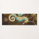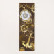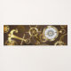 Brauner Holzboden mit Meer, mechanischer Rücken, antikes Lenkrad, goldener Anker und verschiedene Gold- und Messinggetrieben. Steampunkstil.
