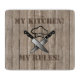 Dieses Design ist mit einem Hintergrund aus Holzeffekten mit einer Grafik von zwei Schneidmesser und einem Hut eines Koch in der Mitte ausgestattet. Über der Grafik Staaten es "My Kitchen" und unter "Meine Regeln" in einem SchablonenSchriftart. Der Text kann so geändert werden, dass er Ihren eigenen Anforderungen Anzug.