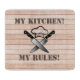Dieses Design ist mit einem Hintergrund aus Holzeffekten mit einer Grafik von zwei Schneidmesser und einem Hut eines Koch in der Mitte ausgestattet. Über der Grafik Staaten es "My Kitchen" und unter "Meine Regeln" in einem SchablonenSchriftart. Der Text kann so geändert werden, dass er Ihren eigenen Anforderungen Anzug.