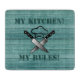 Dieses Design ist mit einem Hintergrund aus Holzeffekten mit einer Grafik von zwei Schneidmesser und einem Hut eines Koch in der Mitte ausgestattet. Über der Grafik Staaten es "My Kitchen" und unter "Meine Regeln" in einem SchablonenSchriftart. Der Text kann so geändert werden, dass er Ihren eigenen Anforderungen Anzug.
