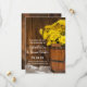 Ankündigen Sie Ihre bevorstehende Hochzeit mit dem charmanten Holzwürtel und Gelben Miles Country Braut Hochzeit Retten Sie das Datum Ankündigungen. Diese informelle, aber elegante Ranch Hochzeit behielt die Datumsanzeige mit einem malerischen, digital verbesserten Blumenfoto aus einem Holzeimer mit gelben, blühenden Blume und einem rustikalen und verwitterten braunen Holzboden.