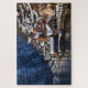 Foto-Puzzle mit den Fassaden der Holzhäuser am See Hallstätter See unter einer Schneeschicht im Winter in Hallstatt, Österreich.