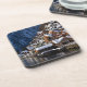 Untersetzer aus Plastik mit den Fassaden der Holzhäuser am Hallstätter See im Winter in Hallstatt, Österreich, unter einer Schneeschicht.