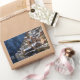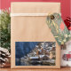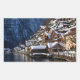 Rechteckiger Aufkleber mit den Fassaden der Holzhäuser am See Hallstätter See unter einer Schneeschicht im Winter in Hallstatt, Österreich.
