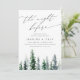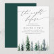 Set für Ihre Hochzeitsfeier mit dieser Kiefernwald-Probe-Dinner-Einladung aus der Holzhüttensammlung von Redwood & Vine Design Co. Mit einer schneegrünen Treeline, fließenden handgeschriebenen Schriften und einem zeitlosen Layout ist diese Einladung perfekt für Waldhochzeiten, Berghütten oder gemütliche Lodge-Umgebungen. Vollständig anpassbar, um Ihre Veranstaltungsdetails Anzug.