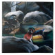 Zwei Holzenten in einem Teich in einem Wald, Bäume und Felsen rund um den Teich, während die männlichen und weiblichen Holzenten den Teich genießen