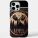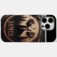 Ein handgeschnitztes Holzschild mit einem Elch mit einem großen Geweih-Set vor dem Hintergrund eines Waldes. Das Wort JAMES wird im Folgenden hervorgehoben dargestellt.