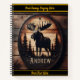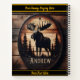 Eine atemberaubende Holzschnitzerei aus einem Elch majestätisch Posen vor einem Hintergrund von Bäumen, die die Schönheit und das Handwerk der Natur zeigen. HINWEIS zum Ändern von Text- oder Grenzfarben mithilfe des Entwurfstools Bearbeiten