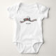 Ein Babyanzug mit einer Illustration handgefertigter Holzspielzeuge: ein lächelnder hölzerner Zug, der sich auf einer kurvenreichen Strecke bewegt, und ein anpassbarer Text, wie z.B. Vorname - ein nettes Geschenk für ein Neugeborenes!