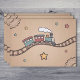Eine Papiertüte mit einer Illustration eines lächelnden Holzzuges, der entlang einer kurvenreichen Strecke gequetscht wird. Der Hintergrund ist ein warmes, gestuftes Beige mit subtilen Details wie Holzgestänge und von Hand gezeichnet Sternen. Eine charmante Option, um ein Geschenk für ein Kind zu verpacken!