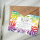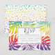 Schwule und lesbische Hochzeit Regenbogen tropische Blätter und Konfetti RSVP-Karte. Es zeigt ein Muster von Monstera und Palmen Blätter in Regenbogenfarben und den Text in einem Rahmen. Die Rückseite bedeckt ein Muster aus bunten Konfetti.