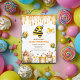 Ein süßes Geburtstagsthema mit Bienen, Honigbären, einem Bienenstock, einem kleinen Vogel und gelben Blumen auf der Vorderseite und einem weiteren Honigbären auf der Rückseite! Sie können diese Einladung mit Ihren Daten personalisieren.