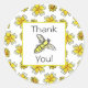Ein helles und fröhliches Dankeschön-Aufkleber mit einer Honigbiene, die in schwarzer Farbe gezeichnet wird, mit Aquarell auf einem gelben Schmetterbecher Aquarell Blume Hintergrund. Sie können den Text an Ihre Bedürfnisse anpassen.
