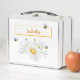 Eine personalisierte Lunchbox mit einem Blumenstrauß und drei niedlichen kleinen Honigbienen. Gut für die Rückkehr zur Schule.