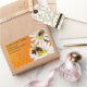Honigbienen bestäuben weiße, bläuliche Blume über einem goldgelben Orangenwabenmuster, personalisiert zur Herstellung von Krümeletiketten für Honig, Bienenwachs, Kosmetika und alle Arten von Produkten. In der Kollektion finden Sie die passenden Cut-Wabenmarken, Visitenkarten und andere wesentliche Elemente des Imkergeschäfts.