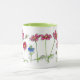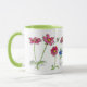 Eine hübsche botanische Tasse mit leuchtend rosa Kosmos-Blume, blauen Nigella und Honigbienen, die in schwarzer Farbe gezeichnet und mit Aquarellfarbe gestrichen wurden. Eine nette Tasse für einen Freund!