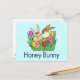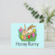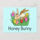 One rabbit kissing another rabbit on the cheek in a field of tulips with caption Honey Bunny.