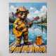 Dieses wunderbare Gemälde zeigt einen Bären, der als Feuerwehrmann verkleidet ist, eine Sonnenbrille und einen Helm trägt und auf einem Holzsteg eine akustische Gitarre spielt. Ein Glas goldener Honig wird daneben platziert. Die Kulisse ist ein friedlicher See umgeben von Bergen, unter einem hellen, teilweise bewölkten Himmel. Die dicken, strukturierten Pinselstriche verstärken den whimsikalen und süßen Charakter der Szene, wobei "Liebe My Honey" hervorgehoben dargestellt wird.
