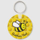 Lächelnder Cartoon über nahtlosen Bienenstock-Hintergrund. Benutzerdefinierter Text auf beiden Seiten.