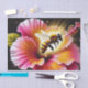 Eine nahe Ansammlung einer farbenfrohen Honigbiene, die Nektar aus einer glühenden Blume des Hibiskus sammelt, die Bestäubung und Naturschönheit symbolisiert, durch lebhafte Farben und einen dynamischen Kontrast vor einem dunklen Hintergrund.