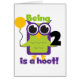 Hoot Owl 2. Geburtstag T - Shirt, Karosserietaschen, Totentaschen, Karten, Aufkleber und vieles mehr mit einer farbenfrohen grünen und lila Eule und Text, der lautet: "Sein 2 ist ein Hobby!".