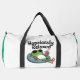 This white duffle bag features a humorous cartoon of a frog wearing sunglasses, relaxing in a beanbag chair with a drink, and the text "Hopelessly Relaxed." This design is perfect for those who embrace leisure and a laid-back attitude. Edit color of the bag caps and body in the Design tool to your favored colors.