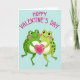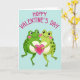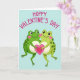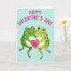 This Valentine’s Day card features two green frogs sharing a loving moment on a soft light blue background. The frogs face each other with wide smiles and gentle expressions, holding a large pink heart between them that becomes the center of the design. Both have heart-shaped blush marks on their cheeks, and one frog has small heart patterns on its skin that echo the theme. Above the illustration, decorative lettering reads “HOPPY VALENTINE’S DAY,” adding a cheerful greeting. The balanced colors and clear details make this card a warm and affectionate way to share Valentine’s Day love