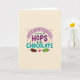 Designed with a creamy beige background, this card centers the phrase “I’m just here for HOPS & the CHOCOLATE” in a tall, vertical layout that reads like a shared joke between close friends 🐰. Above the words, a looping magenta decoration curves like candy ribbons, dotted with small fuchsia hearts that feel like little nods of affection. The smaller words “I’m just here for” and “& the” sit neatly around the main line in dark lettering, keeping the eye moving down the page. “HOPS” stands out in plum purple, while “CHOCOLATE” lands in deep teal, giving the message a fun contrast without being loud. Around the text, tiny hearts in pink, yellow, and green mingle with short dash marks, like confetti scattered during a cozy spring get-together 🌷. At the bottom, two long seed-pod shapes anchor the design, one earthy brown and the other emerald green, side by side as if keeping each other company. The magenta ribbon-like arc sits above the centered text, and the paired pods rest along the lower edge beneath the last line.
