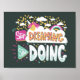 Niedliches buntes "Stopp Dreaming Start Doing" Zitat mit Regenbögen, Sternen und Einhornkopf.