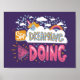 Niedliches buntes "Stopp Dreaming Start Doing" Zitat mit Regenbögen, Sternen und Einhornkopf.