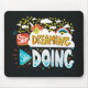 Niedliches buntes "Stopp Dreaming Start Doing" Zitat mit Regenbögen, Sternen und Einhornkopf.
