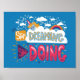 Niedliches buntes "Stopp Dreaming Start Doing" Zitat mit Regenbögen, Sternen und Einhornkopf.