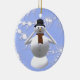 Jeder Schneemann trägt einen schwarzen Hut, hat zwei große blaue Augen, eine orange Karottennase und dünne Zweige für Lippen. Ein roter und grüner gemusterter Schal wird um seinen Hals eingewickelt. Drei graue Knöpfe laufen hinunter seinen großen Kreiskörper. Die Arme werden über das Gesicht des Schneemanns mit jeder Hand in Position gebracht, die fünf Stellen hat, entweder seine Ohren, Augen oder Mund zu bedecken.