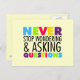 Das helle mehrfarbige Textdesign steht für "Nie aufhören, Fragen zu erstaunen und Fragen" auf inspirierenden Message-T - Shirt, Magneten, Tasten, Totentaschen, Karten, Aufklebern, Schlüsselketten, Mousepads, Wasserflaschen und vielem mehr. Diese motivierend Nachrichten sind ideal für LehrerInnen und andere LehrerInnen!