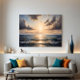 Ein Kunstwerk, das die unendliche Gelassenheit des Ozeans bei Sonnenuntergang einfängt, wo weiche Wolken und der goldene Horizont zum Nachdenken einladen. Das Meer spiegelt Licht und Stille wider und ruft Frieden, Freiheit und die zeitlose Schönheit der Natur hervor.