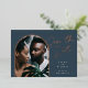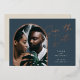 Die elegante Save the Date-Optik mit einzigartigem Layout weist ein vertikales Foto in gewölbter Form auf einem marineblau-blauen Hintergrund auf, mit "Save the Date" in Rose mit Goldfolie und Schriftzypografie. Personalisieren Sie Ihre Namen, das Hochzeitdatum und den Ort, und fügen Sie zusätzliche Details auf die Rückseite. Ein atemberaubendes Design in einer üppigen Farbpalette für die Ankündigung Ihrer Hochzeit.