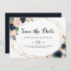 Diese goldene geometrische Winter Blumen horizontalen Hochzeit speichern das Datum ist perfekt für eine elegante Hochzeit. Das Design besticht durch farbenfrohe goldene Blume und grünes Blattwerk, das in hübsche Bouquets eingefasst ist und einen künstlerisch geometrischen Rahmen verziert.